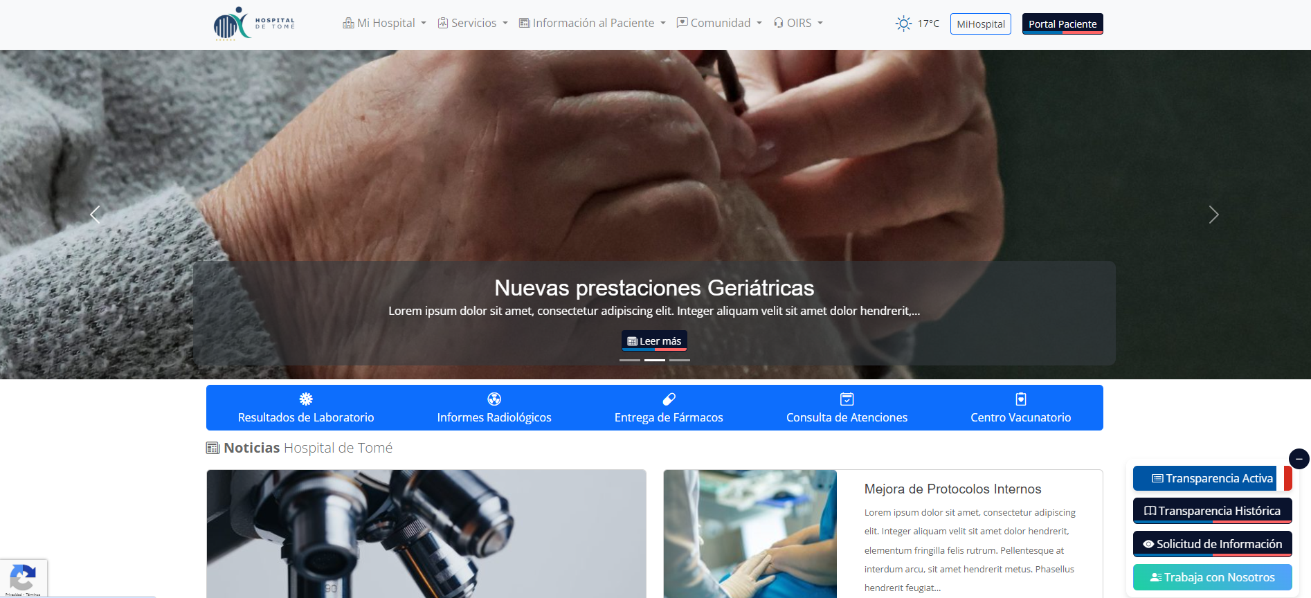 El Hospital de Tomé, comprometido con la transparencia y la mejora continua de los servicios hacia la ciudadanía, se enorgullece en anunciar el lanzamiento de su nuevo sitio web institucional. Este renovado canal digital ha sido diseñado para responder a las necesidades de información de la comunidad externa, incluyendo a ciudadanos, organizaciones sociales y líderes comunitarios, fomentando una relación más cercana y participativa.